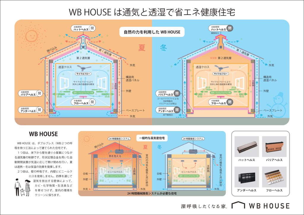 WB工法は、壁の中の通気性を確保しながら、高い断熱性能を実現する工法です。夏は涼しく、冬は暖かい、一年を通じて快適な住環境をご提供します。